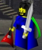 Description: Lego-ish figure in blue dress, with beard and breasts, holding sword and electric guitar